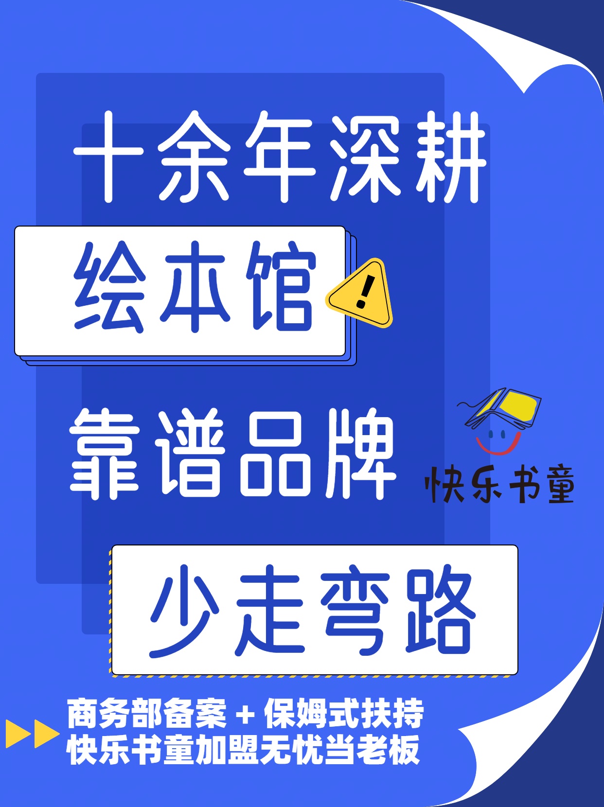 告别职场焦虑与育儿迷茫,从开一家快乐书童社区绘本馆开始。我们以专业实力为你护航,让你在传递书香的路上,兼顾事业与家庭,收获双倍幸福与成就。现在加入,与快乐书童并肩,共赴这份有温度、有前景的创业之旅!